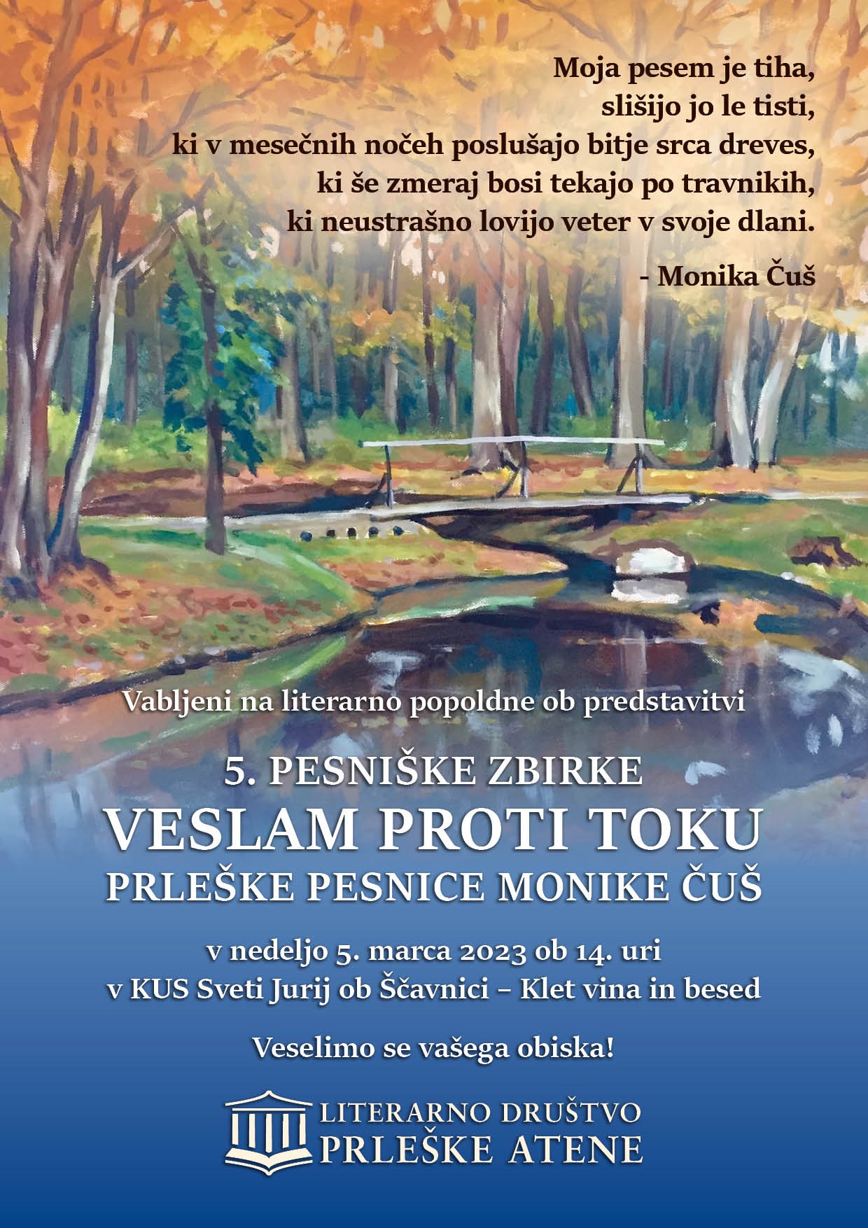 V marcu 2023 smo v Kleti vina in besed v KUS Sv. Jurij ob Ščavnici predstavili peto pesniško zbirko Monike Čuš z naslovom Veslam proti toku. Z avtorico se je pogovarjala Breda Žunič.